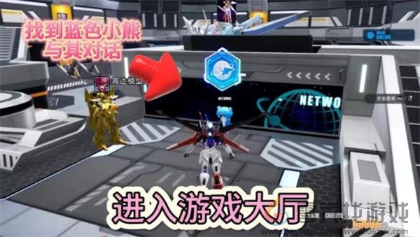 高达破坏者4加入团队方法介绍1.启动游戏后,在进入到游戏大厅先找一个蓝色小熊和它互动。